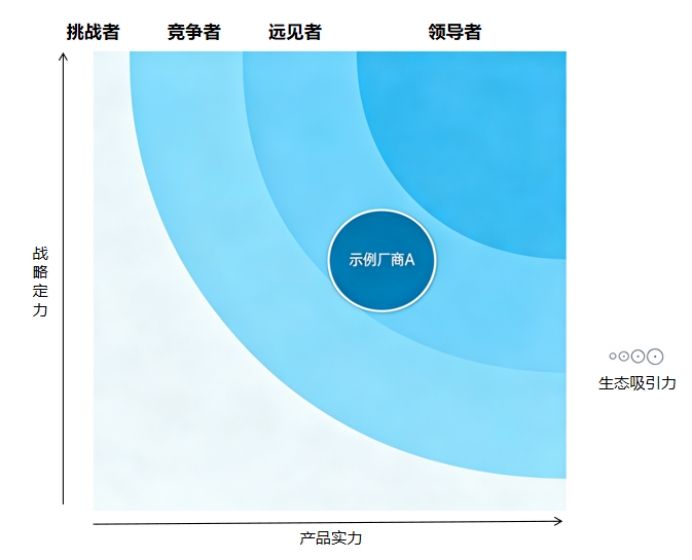 最終,我們不會(huì)簡(jiǎn)單排出123名,而是繪制出"引力象限圖":X軸代表企業(yè)當(dāng)前的產(chǎn)品實(shí)力,而Y軸則代表企業(yè)當(dāng)前產(chǎn)品戰(zhàn)略,圓圈大小則代表生態(tài)吸引力。同時(shí)引力象限被劃分為四個(gè)區(qū)域——領(lǐng)航者、遠(yuǎn)見者、競(jìng)爭(zhēng)者、挑戰(zhàn)者。這種二維定位比線性排名更能反映企業(yè)的真實(shí)處境。