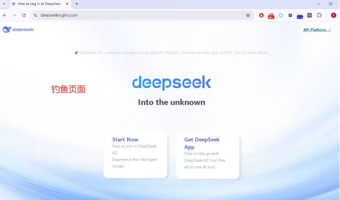 以釣魚網(wǎng)站“https://deepseeklogins.com/”為例,其頁面結(jié)構(gòu)和風(fēng)格與 DeepSeek 官方網(wǎng)站高度相似,旨在通過偽造官方頁面來誘導(dǎo)用戶泄露敏感信息。與真實(shí)網(wǎng)站相比,釣魚頁面移除了中英文切換的超鏈接。在該釣魚頁面中,點(diǎn)擊右上角的“API Platform”鏈接將會(huì)引導(dǎo)用戶跳轉(zhuǎn)到偽造的登錄頁面。