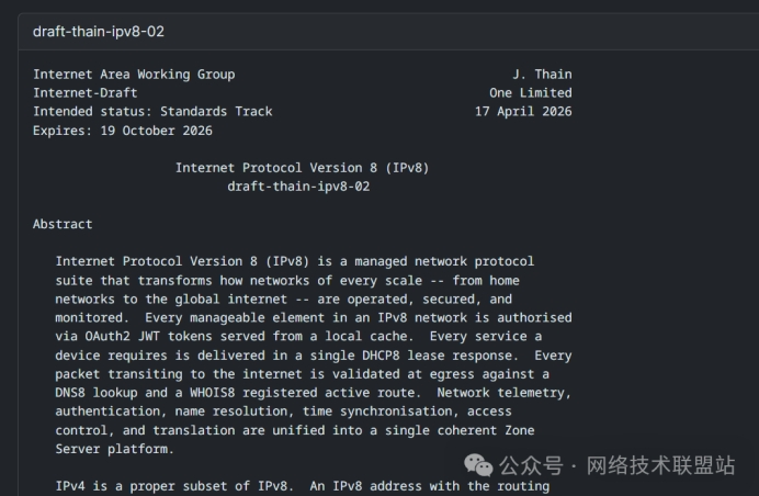 2026年4月14日,互聯(lián)網(wǎng)工程任務(wù)組(IETF)收到一份名為《Internet Protocol Version 8 (IPv8)》的核心協(xié)議草案,由百慕大公司One Limited的Jamie Thain提交。這份草案迅速成為全球科技圈焦點(diǎn)。它提出采用64位地址空間,理論上可提供2^64約1844.67億億個(gè)獨(dú)立地址,同時(shí)實(shí)現(xiàn)對(duì)現(xiàn)有IPv4協(xié)議的100%向下兼容,無需任何設(shè)備、應(yīng)用或網(wǎng)絡(luò)架構(gòu)修改即可無縫接入。