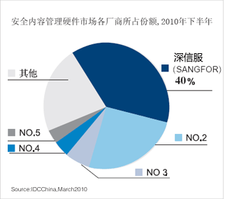 深信服科技在IDC中國發(fā)布的2009年下半年中國安全內(nèi)容管理市場(上網(wǎng)行為管理市場)報(bào)告中占有率達(dá)到33.8%,超出第二位廠商達(dá)一倍多。